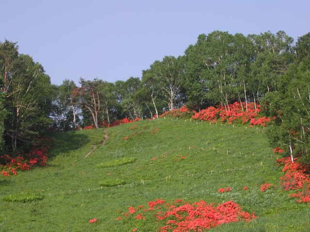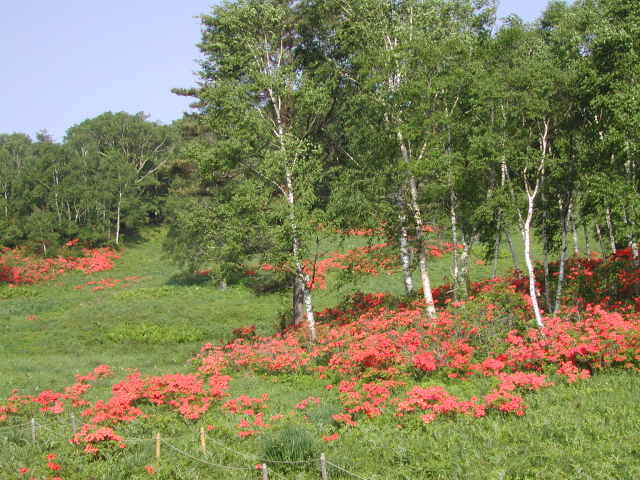 カバの白や草原の緑とレンゲツツジの燃える ようなオレンジの対比がすごいです。 |