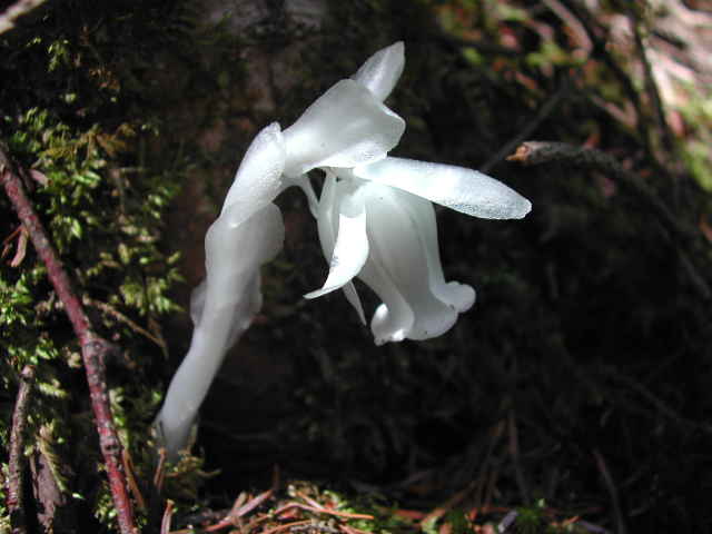 森の中には「ゆうれい草」の異名を持つギンリョウソウが花を つけていました。葉緑素を持たない草です。真っ暗な林の中, 真っ白な体が妙に目立ちます。 |