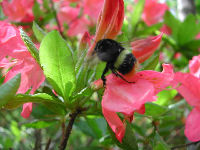 レンゲツツジの花にオオマルハナバチが来ていました。 おなかのクリーム色・黒・オレンジ色の横縞もようが特徴的です。