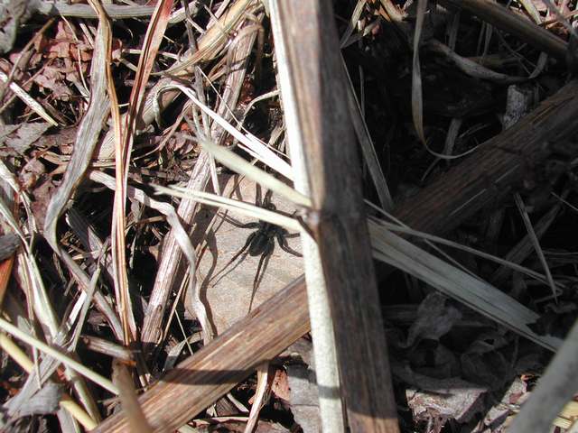 地表では,徘徊性のクモがひなたぼっこをしていました。 (画面中央。黒い。一部,枯れ草で隠れています) |