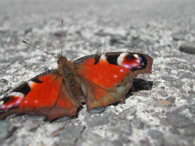 ロッジ前のベンチでお昼を食べていたら,どこからか クジャクチョウが飛んできて,ロッジのコンクリートに止り, ひなたぼっこを始めました。よくぞ冬を越したなあ・・・ と思わず目が細くなってしまいました。羽根のりんぷんが 擦り取れ,羽根に傷が付いていることが分かります。 |