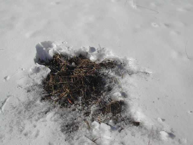 たぶんキツネが,たぶんハタネズミの 巣を掘り返した跡でしょう。ハタネズミは つかまっちゃったのかな? |